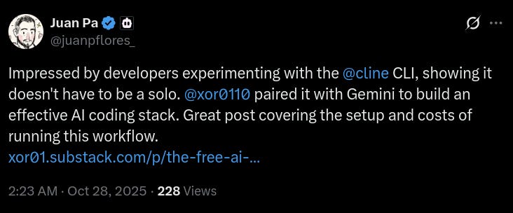 3. To Get Your Product Noticed, You Have to Be Noticed. Your personal brand is a powerful marketing tool. When I genuinely praised the Cline CLI tool in an article, their developer advocate retweeted me, giving my profile a small but meaningful boost. Authentic appreciation builds bridges and creates goodwill that direct advertising never can.