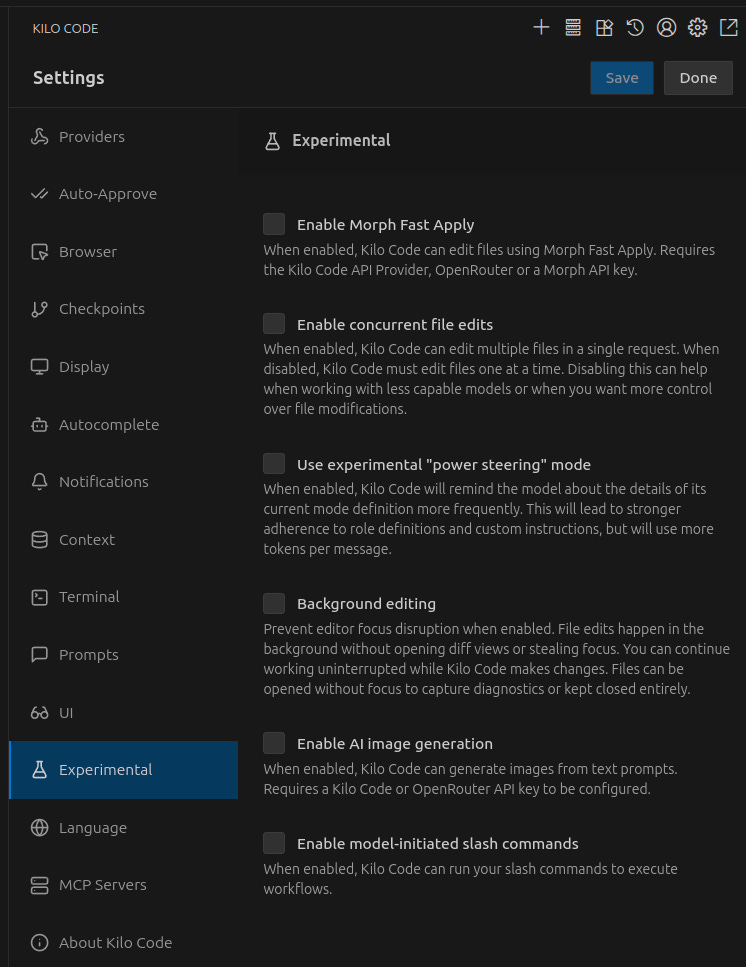 I opened Kilo Code settings and without much hope disabled two checkboxes in the “Experimental” tab: Enable concurrent file edits